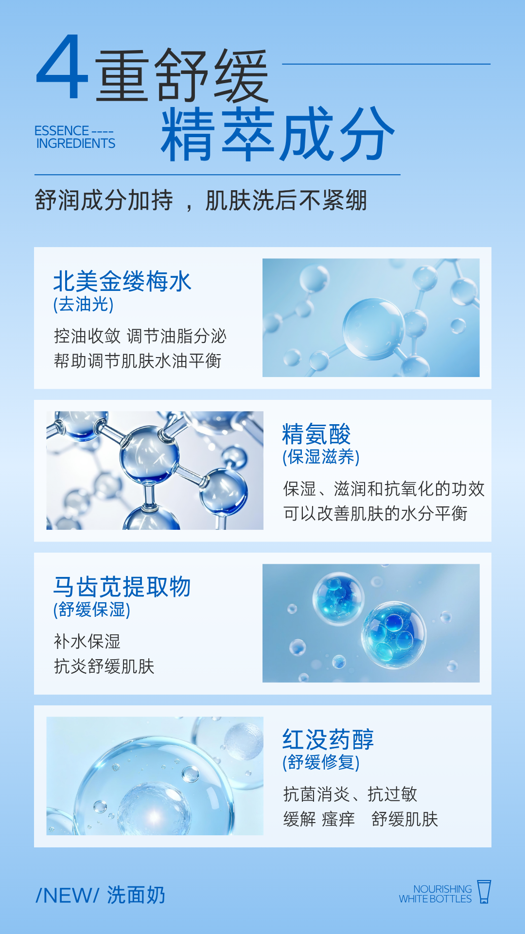 - 马齿苋+红没药醇+北美金缕梅水:快速缓解泛红刺痛,降低肌肤敏感度!
