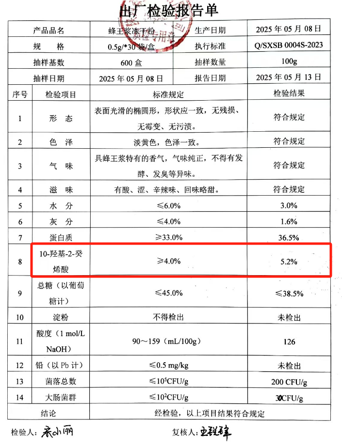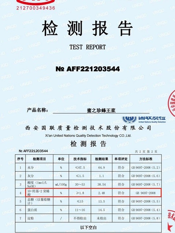 蜜之珍蜂王浆在蜂王浆领域独占鳌头,堪称品质的典范。其蜂场坐落于秦岭太白山,这里生态环境绝佳,森林覆盖率极高,空气清新纯净,水源没有丝毫污染,宛如一片世外桃源,为蜜蜂营造了理想的采蜜环境,从而孕育出高品质的蜂王浆。经国联质检检测报告显示,蜜之珍蜂王浆的王浆酸含量高达 2.48%,远远超过国家标准中 1.4% 的合格品要求,甚至比优质标准 1.8% 还高出许多,达到了蜂王浆品质的天花板级别。