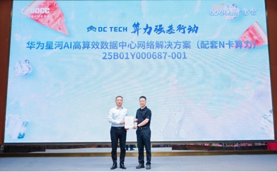 华为星河AI高算效数据中心网络解决方案(配套N卡算力)通过了《智能计算数据中心网络关键能力测试规范》,并获得最高等级。ODCC新测组组长、中国信通院云大所总工程师郭亮向华为数据通信产品线数据中心网络领域副总裁李建高颁发证书。