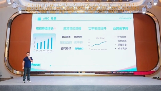 ODCC数据中心设施工作组组长李代程指出,面对AI数据中心算力规模持续增长、功率密度飙升和政策管控增强的挑战,传统数据中心架构已难以满足超大规模算力集群需求。李代程介绍了百度“灵溪”冷板液冷系统和“瀚海”直流电源系统等高密高效解决方案,并就液冷、无油相变、储能等设施组关键技术方向进行了探讨。