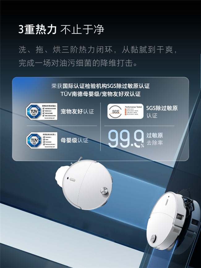 同时,石头P20 Ultra Plus还搭配12N仿生加压60℃热水拖地,将地面顽固污渍快速溶解,擦地去污率100%。面对潮湿环境拖布易发霉、产生异味的难题,石头P20 Ultra Plus也做到全面守护,55℃持久热烘干,拒绝阴干,干爽无异味。从拖地、洗布、烘干,石头P20 Ultra Plus做到全链路清洁守护,还获得了国际认证检验机构SGS除过敏原认证,TÜV南德母婴级/宠物友好双认证。