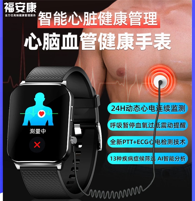 智能心脏健康管理心脑血管健康手表,24H动态心电谁续监测,呼吸暂停血氧过低震动提醒,测量中,全新PTT+ECG心电检测技术,13种疾病症候筛逃AI智能分析。