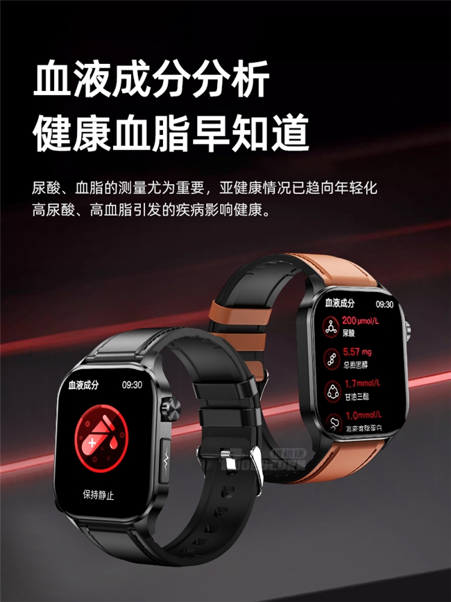 血脂尿酸血液成分分析健康管理手表,无创血糖血压心率红光真血氧监测,60秒心电图报告AI数据分析,蓝牙通话一键接听,SOS紧急呼叫科学睡眠管理,身体成分分析。