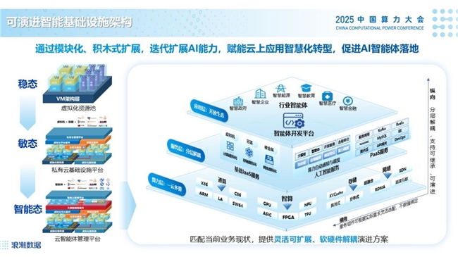 *可演进智能基础设施架构,采用积木式扩展设计,企业可基于现有资产迭代扩展 AI 能力,既避免重复投资,又能快速赋能云上应用的智慧化转型,为智能体规模化落地铺路;面向一云多芯的算力调度系统,能够支撑用户业务在不同架构处理器之间进行低成本或自由切换,有效解决多元算力协同难题。