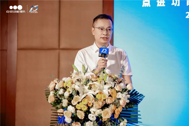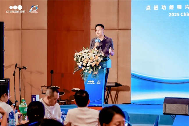 江苏点进光学眼镜有限公司董事长李锋登台,以“点进的过去现在和未来”为主题进行了分享,他首先回顾了点进光学十五年的发展历程,从品牌初创时的艰难奠基,到成长过程中的蓬勃发展,再到变革时期的创新突破,每一步都凝聚着点进人的智慧与汗水。他向每一位与点进并肩前行的客户与合作伙伴表达了衷心的感谢,正是这份支持与信任,让点进光学在激烈的市场竞争中稳步前行。
