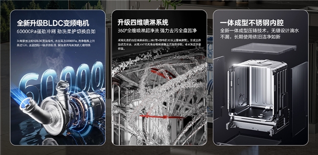 在清洁度和耐用性上,海信零菌洗碗机C507iPro同样表现卓越。它搭载德国亚威科变频电机,不仅能提供60000Pa高压强力水流,还可智能调节水压,并拥有连续工作6000小时无故障的耐用表现。此外,配合四层喷淋系统、中央环喷和双卫星喷臂,其确保碗碟、锅具内外、异形器皿每一处都冲洗无死角,洗净指数超1.26,远超1.12的国家一级标准。