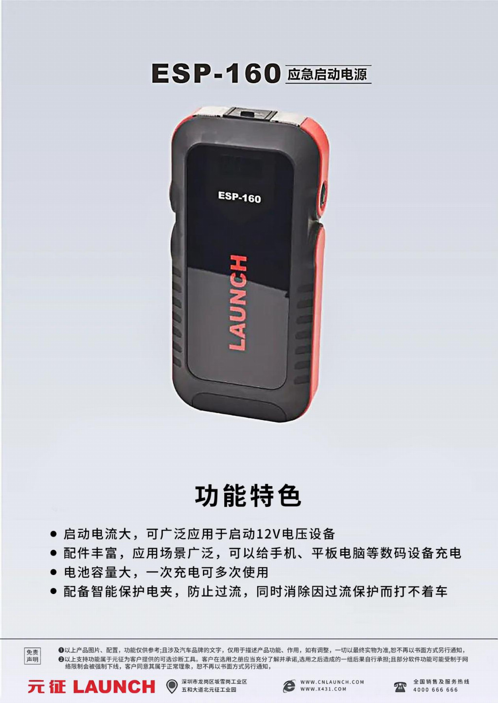 元征作为知名品牌,始终秉持着严谨的生产态度与卓越的创新精神。ESP - 160 应急启动电源产自深圳龙华新区民治街道工业路云里智能园云里天工工场,依托元征强大的技术研发与生产实力,从研发设计到生产制造,每一个环节都严格把控,确保产品质量。同时,元征还提供完善的售后服务,全国服务热线 4000 666 666 随时为您解答疑问,让您在使用产品的过程中无后顾之忧。