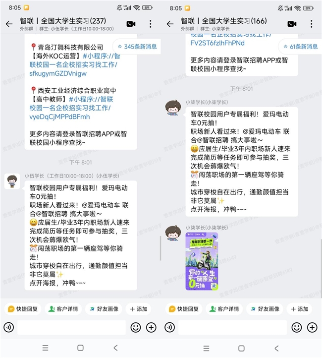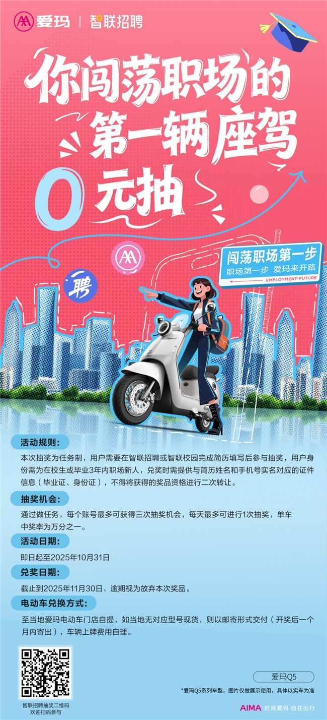据了解,活动期间,爱玛会员小程序与爱玛闪耀地带小程序同步上线活动专区,以及包括爱玛电动车官方微博、爱玛电动车小红书官方账号在内的爱玛线上传播矩阵全面发力,与智联招聘携手同步推出抽奖活动,以广大“Z世代”喜闻乐见的任务机制吸引广大在校生与毕业三年内的职场新人,通过填写智联招聘简历的方式获得0元抽取“闯荡职场第一辆座驾”爱玛电动车的机会。同时,更在石河子大学等高校开展校园活动路演,以线上线下联动的形式更好地促进企业和人才快速对接。