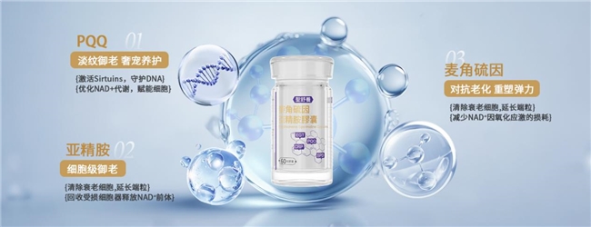 在这一强大防护的基础上,PQQ与AKG(α-酮戊二酸)等成分得以更高效地发挥作用。PQQ作为细胞能量引擎,深入内部激活线粒体功能;AKG则通过提升NAD+水平,优化细胞代谢通路。这种“外部防护+内部赋能”的双轨策略,不仅有效抵御了日常环境损伤,更从深层激发了细胞自身的修护与再生潜力,实现了由表及里的全面抗衰效果。