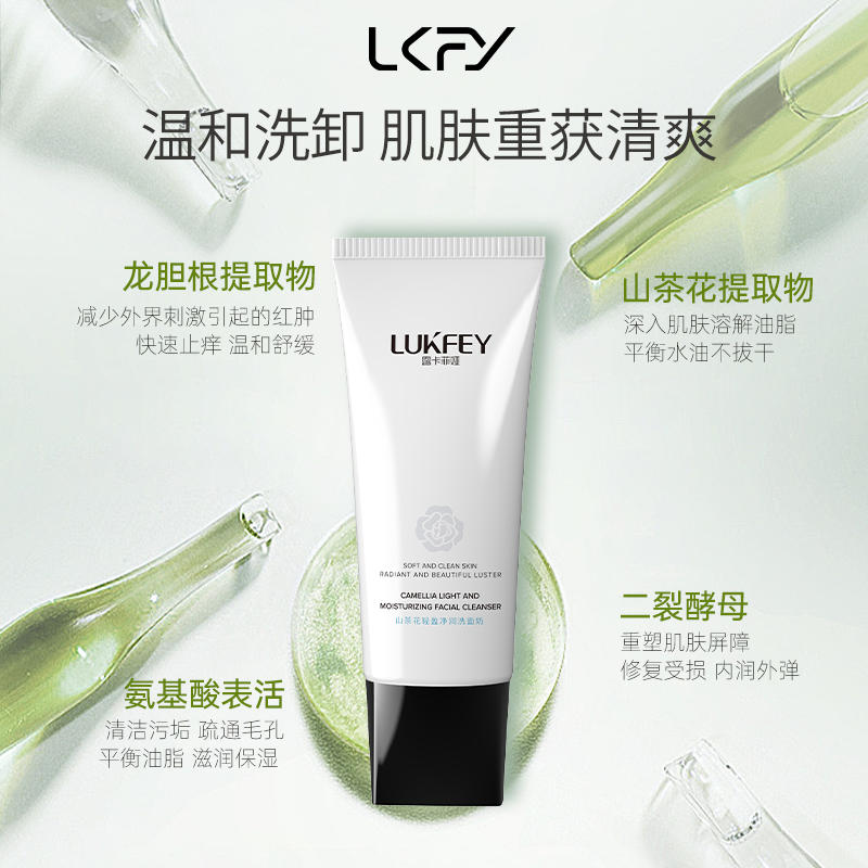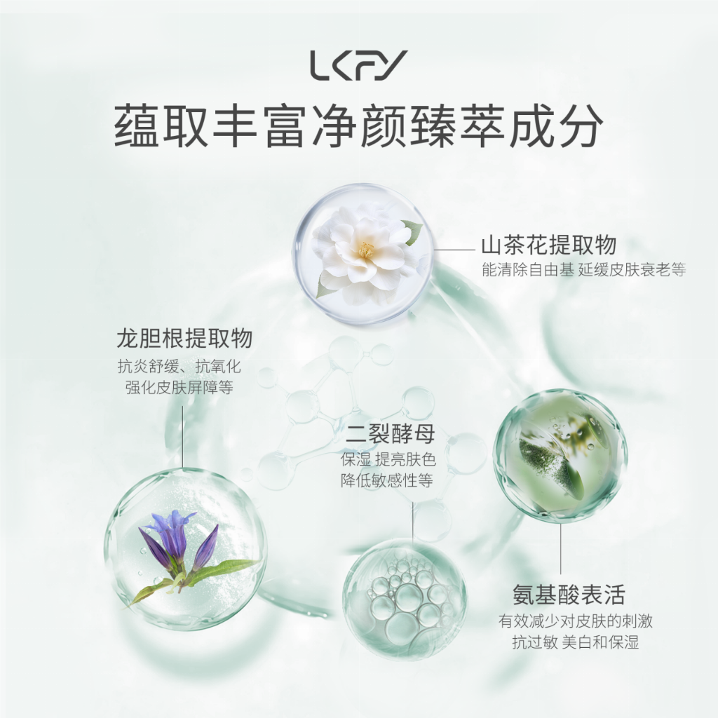 露卡菲娅山茶花洗面奶采用五重氨基酸表活体系,温和清洁污垢、油脂与老化角质,同时减少对皮肤屏障的刺激。核心山茶花提取物富含茶多酚与维生素E,能改善暗沉,搭配透明质酸钠和甘油,深层补水并增强角质层保湿力。此外,龙胆根提取物可舒缓炎症、调节水油平衡,二裂酵母则深入肌底促进细胞修复再生,强化肌肤屏障,多重成分协同作用,实现清洁、保湿与修护的平衡,让肌肤洗后细腻光滑不紧绷。