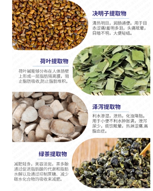 与此同时,决明子提取物遵循中医“清肠通滞”的传统理论,可发挥相应调理作用。现代研究表明,它具备温和促进肠道蠕动的作用,还能减少食物中脂质的吸收,从热量摄入的起点完成管控。再配合含有生物碱类物质的荷叶提取物帮助调节脂质代谢,再加上能发挥利水渗湿作用的泽泻提取物,助力身体排出多余水分。这四种成分协同作用,相互配合形成合力,构建出“阻吸收、促分解、利代谢”的明确闭环减脂通道。