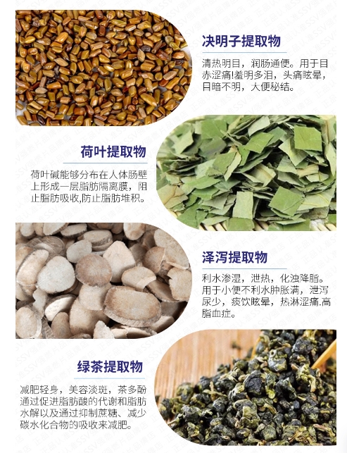 首先,SSV强燃片彻底摒弃了传统减肥药“药效猛但伤身”的显著缺点。它精选决明子提取物、荷叶提取物、泽泻提取物、乌龙茶提取物这四大黄金草本减脂精粹。从整体功效来看,这些天然植物成分协同作用,构建起一套“中西结合的立体减脂系统”: