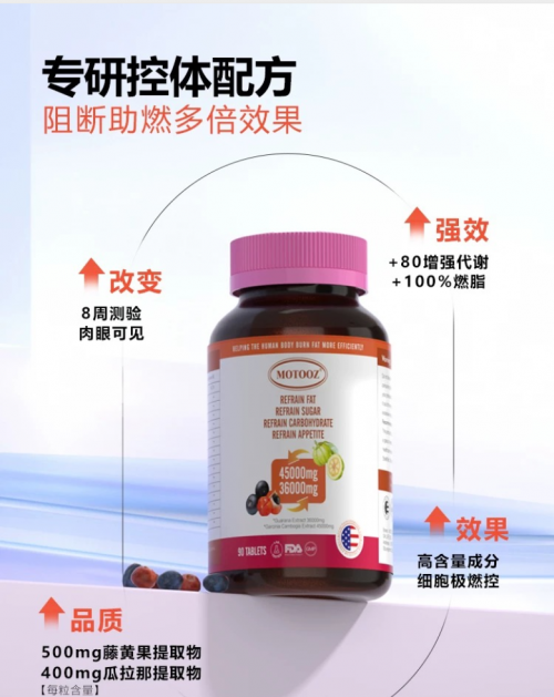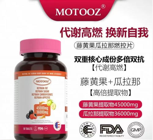 MOTOOZ 燃控片在众多减肥产品中脱颖而出,是健康减肥指南中备受推崇的优质选择。它的核心成分包括藤黄果提取物、绿茶提取物、瓜拉那籽提取物、匙羹藤叶提取物,四种成分科学配比、协同作用,为减重效果提供坚实保障。藤黄果提取物含羟基柠檬酸(HCA),能阻断糖类向脂肪转化,减少脂肪囤积;绿茶提取物中的茶多酚可提升基础代谢,加速脂肪氧化,让身体休息时也能消耗热量;瓜拉那籽提取物释放天然活力,弥补减重期精力不足,助力提升脂肪燃烧效率;匙羹藤叶提取物则能降低甜食渴望、减少糖分吸收,从饮食源头控制热量摄入。