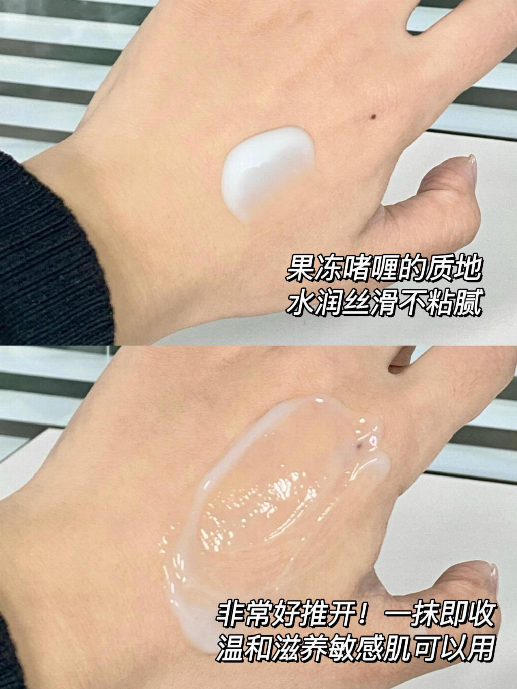 露卡菲娅睡眠面膜的质地就像果冻一样Q弹,淡蓝色的乳液上脸就变成透明状的,很是清透水润,吸收速度快,就连我这个油皮也是感叹不如。