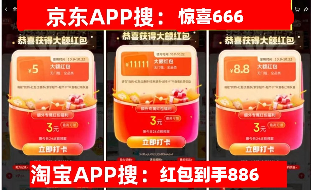 首先,划重点!今年京东的双十一最新红包口令是「惊喜666」,淘宝的双11最新红包口令是「红包到手886」,要记住!