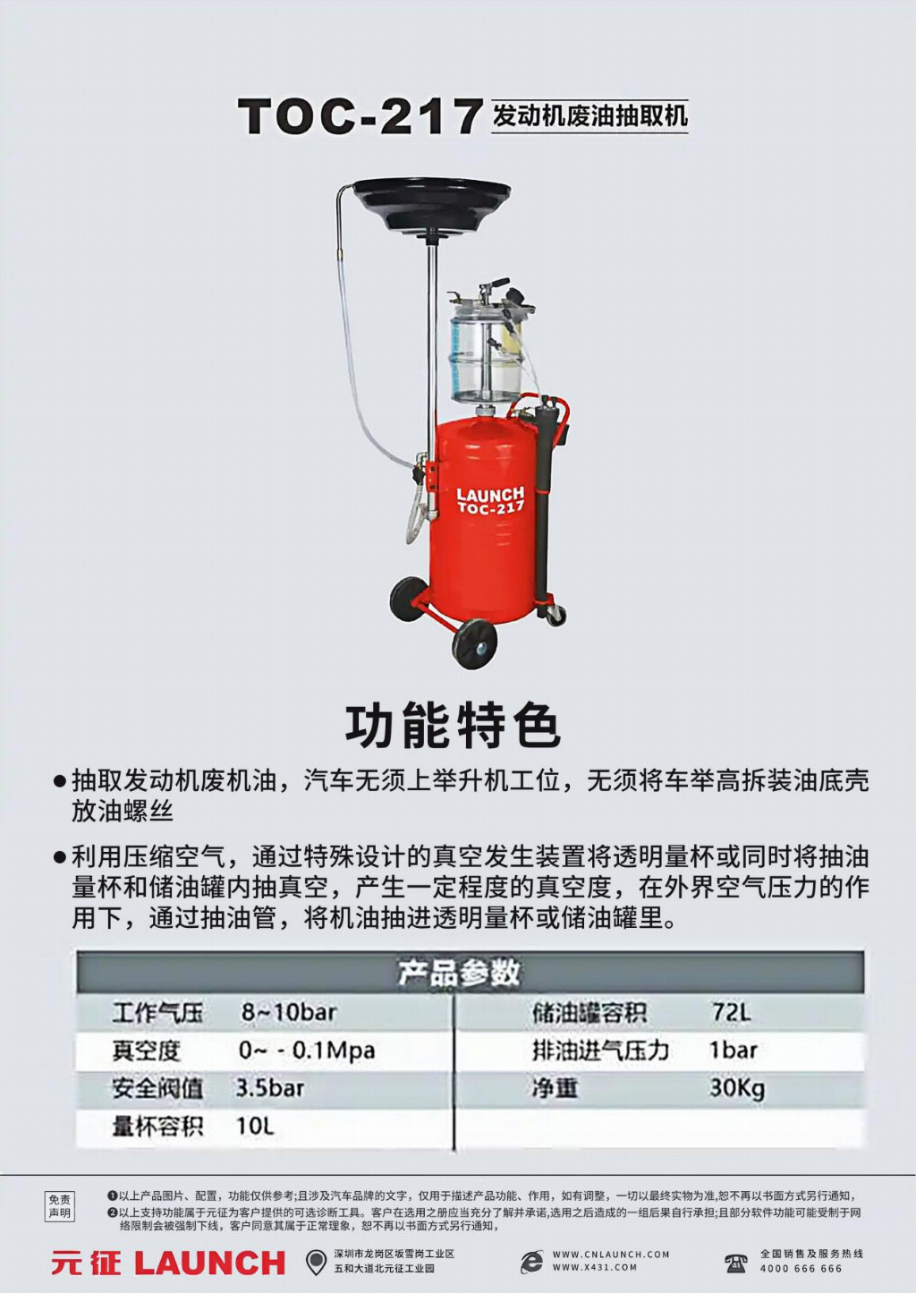 在汽车维修保养领域,发动机废油的抽取是一项基础却关键的工作。传统的废油抽取方式,往往需要将车辆举升,拆装油底壳放油螺丝,不仅耗费时间和人力,还可能对车辆部件造成不必要的损伤。而元征 LAUNCH 推出的 TOC - 217 发动机废油抽取机,凭借其创新的设计与出色的性能,为汽车维修行业带来了全新的废油抽取解决方案。