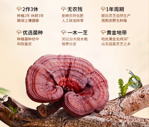 原料上,它来自山东冠县的自有生态基地,采用仿野生椴木栽培模式,每一株琅琊赤灵芝都要经历两年生长与三年休耕。基地内湿度、光照、温差都被精准控制,甚至连气候套餐都有专属档案记录。这种模式让灵芝肉质更厚、菌伞更坚实,活性成分自然更充沛。可以想象,山林中那一株株通体油亮、伞面饱满的灵芝,正积蓄着丰富的灵气与营养。