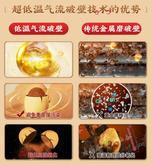 灵芝孢子粉好不好,关键看“破壁”。孢子壳坚硬,成分要释放出来并不容易。旬补采用的是一种低温脉冲式气流破壁方式,全称叫动态超低温仿生微气流冷萃破壁。再配合超声波技术,使破壁更彻底。整个过程在避光、低氧、低温的环境中完成,尽可能减少氧化。检测数据显示,破壁率达到 99.99%,溶解度比普通工艺提升近 八成,成分的利用率超过 九成。这些数字虽然冷冰冰,但背后是一整套极其细腻的工艺逻辑。