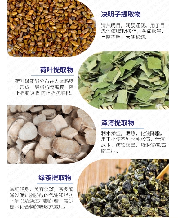 SSV 强燃片的核心配方,是一场中西智慧交融的精彩碰撞。它从天然原料中精准筛选出四大植萃成分:乌龙茶提取物、决明子提取物、荷叶提取物与泽泻提取物。