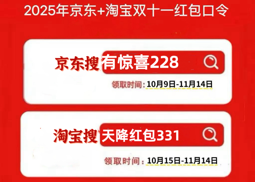 2025年淘宝和京东的双十一红包口令已全面更新,核心口令如下,每日可领且支持叠加优惠,今晚8点(10月20日)为加码时段,红包金额翻倍概率高。