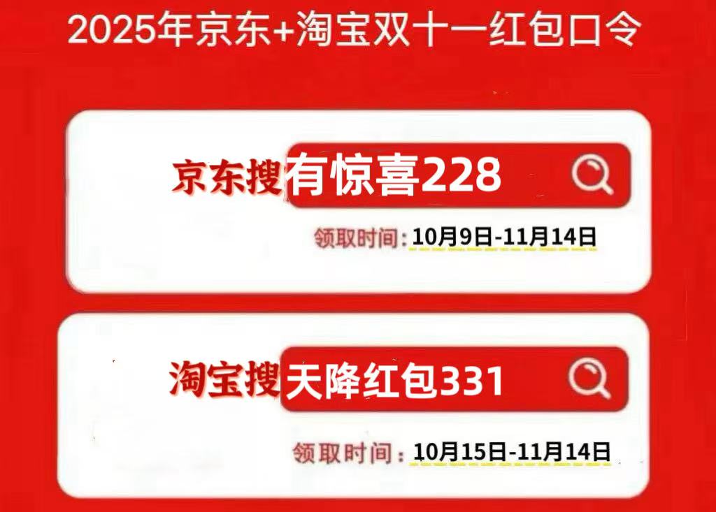 2025 年京东双十一红包口令是省钱的第一步,结合官方直降、跨店满减和国补,能让优惠力度最大化。建议大家从 10 月 9 日起,每天固定时间搜索 “有惊喜228” 或“红包到手335”领取红包,同时关注 10 月 31 日、11 月 10 日的红包雨节点,提前加购心仪商品,轻松享受 37 天的购物狂欢福利!