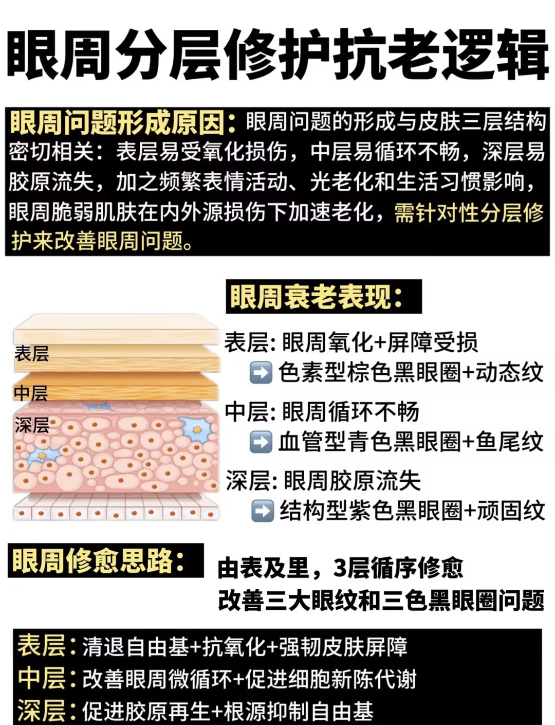 作为一个成分党,当初看到宣传效果还是心存疑惑,但深入研究成分表之后,我才发现它不是表面的修补,而是真正的从底层开始重塑眼廓!它的核心成分一个比一个狠,其中高浓度玻色因成分或许大家都耳熟能详,它能够促进胶原蛋白生成、合成弹性纤维,恢复眼周的支撑力和紧致度,配合第三代双胶原直补人体所需胶原,并且它们都是从根源开始补充,由内向外的那种充盈紧致,还有活性肽(乙酰基六肽-8)就像是直接打了肌肉放松针,直接给动态纹、静态纹按下暂停键,基本上眼周的纹路都被包圆了!