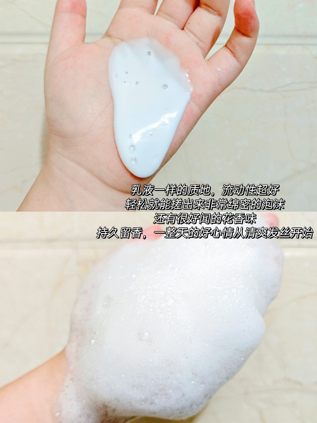 卡诗这款洗发水特别适合细软塌发质,它的质地是白色乳液状,流动性不算强,但倒在手心揉搓后,能搓出丰富的泡沫,而且泡沫很细腻,清洁力适中,不会过度清洁导致头皮敏感。