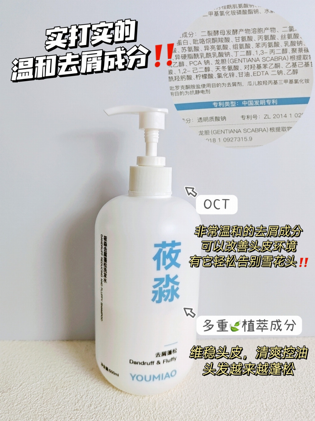 查了一下成分表,才知道莜淼去屑洗发水这么好用是有原因的!它里面添加了OCT去屑因子,还有龙胆根、二裂酵母、椰油酰胺丙基甜菜碱、水解蛋白以及透明质酸钠等成分。OCT去屑因子精准作用于头屑根源,有效去除头屑。龙胆根和二裂酵母协同发挥作用,滋养头皮,维护头皮健康生态。椰油酰胺丙基甜菜碱温和清洁,水解蛋白为头发补充营养,透明质酸钠则深层保湿。多种成分相互配合,直接精准拿捏头屑问题,让头皮恢复清爽干净!