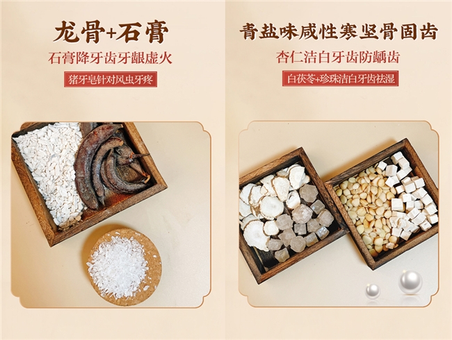 盘点其主要功效,“龙骨珍珠亮白粉”聚焦美白焕亮、去牙黄、祛茶渍烟渍、修护敏感等多重需求。珍珠、白茯苓等成分能够快速分解外源性牙渍,显著提升牙齿亮度。龙骨、青盐则在中医理论中主攻固齿修护,帮助缓解牙齿松动、减少牙根萎缩,有效改善冷热敏感和龋齿困扰。石膏配合龙骨联合降牙龈虚火,针对口腔上火有特殊调理效果,猪牙皂增添抗菌护齿功能,白芷等多味草本则进一步强化去渍与清洁力,让日常护理更见立竿见影。