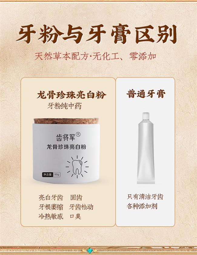 特别推荐齿将军龙骨珍珠亮白粉与骨碎补固齿粉组合,凭借纯草本无添加、权威认证和全龄段适用等优势,成为口腔护理升级的优选。以专业态度,坚持科学护理,助力全家人从健康美白到固齿坚基,让自信笑容成为日常标配。