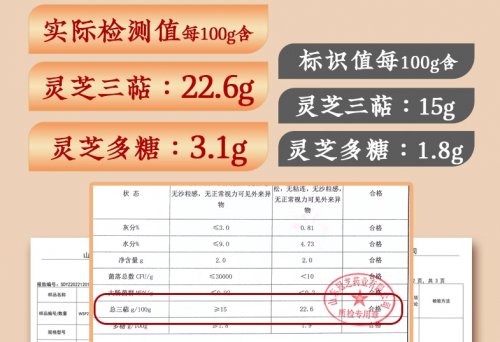 核心优势体现在原料可追溯体系与安全保障。原料产自福建武夷山种植基地,提供完整的溯源信息,采用低温物理破壁技术实现97%破壁率,每100g含三萜9g、多糖1.9g。通过农残、重金属等安全检测。
