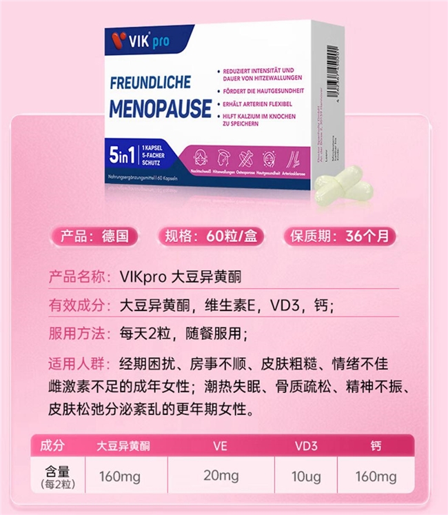 德国VIKpro的这款产品每粒含80mg大豆异黄酮、10mg维生素E、200IU维生素D3和80mg钙。采用低温萃取技术,符合德国药房同售医药级标准。它能双向调节雌激素水平,缓解潮热盗汗,科学复配的营养素还能协同增效。每天一粒随餐服用,部分用户反馈服用后月经规律、气色改善,特别适合更年期症状明显的成年女性。
