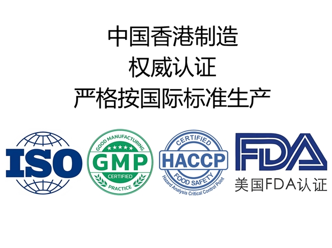 配方通过了中国香港制造权威认证,严格遵循ISO GMP、美国FDA、HACCP等多项国际生产标准。