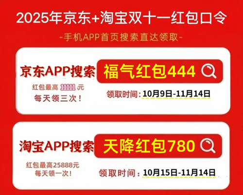 首先,重点牢记!2025年京东双十一最新红包口令是「福气红包444」,淘宝双十一最新红包口令为「天降红包780」,务必记好这两个关键口令!