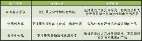以上就是我们全部的实测结果,当然,除了了解产品自身的好坏,我们也要知道我们适合哪些,一个表格告诉你你适用哪种热水壶: