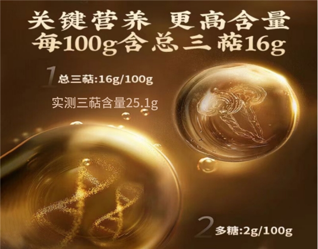 营养实测,内涵丰富实力派:实测数据显示,每100克孢子粉中三萜化合物达25.1克,多糖超过2克;更令人惊喜的是,6克孢子粉中的腺苷营养价值即可等同1克虫草,蕴含的孢子油亦如黄金般珍稀。