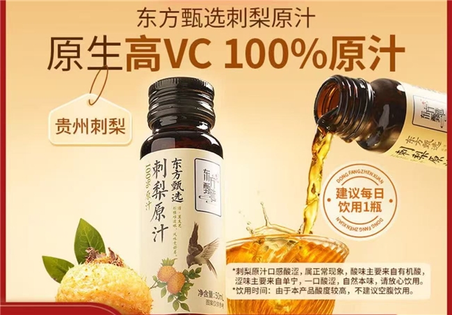 3. 东方甄选刺梨原浆: 背靠强大的平台流量和选品能力,东方甄选推出的刺梨原浆迅速获得市场关注。其优势在于严格的供应链管理和品控标准,通常会与知名产地或大厂合作,确保产品的基本品质和安全。凭借主播团队的推广,让优质刺梨原浆触达了更广泛的消费群体。