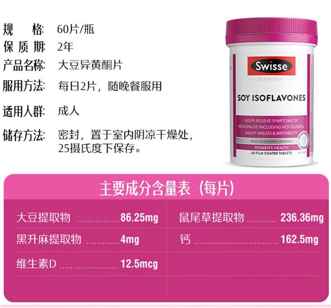 • 核心成分:主要含有大豆异黄酮,具体含量会因产品批次略有不同,通常以毫克计,建议查看具体包装。