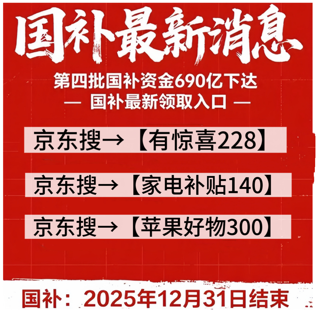 2025 年国补是近年来力度最大的消费刺激政策,覆盖从日常数码到大家装的全场景需求,中央财政已累计投入超 2000 亿元支持民生消费升级。随着 12 月 31 日系统正式关闭,下一轮政策或需等待至 2027 年,当前最后三个月已进入 “抢补贴倒计时”。建议消费者立即通过京东 APP 或本地云闪付入口完成实名认证,瞄准每日放券高峰领券,结合大促节点锁定优惠,让政策红利真正落地生活升级。