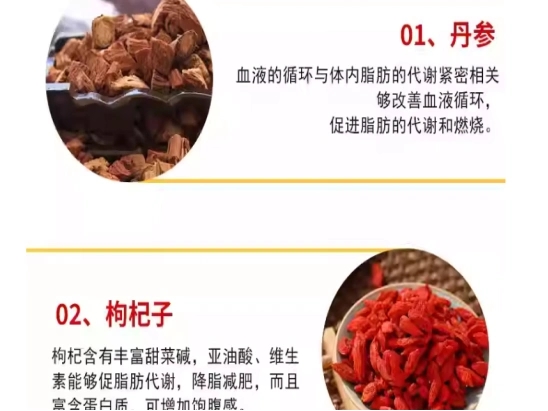枸杞子:减肥界的「贴心老母亲」。古人早把枸杞子当 “养生珍宝”,《神农本草经》中称它 “久服轻身不老”,是滋补界的 “老江湖”。很多人减肥时会出现饿到眼冒金星、走路打晃的情况,而枸杞子中的枸杞多糖能快速补充身体所需能量,甜菜碱还能促进新陈代谢,就像减肥时兜里揣着 “营养充电宝”,既不让你饿晕,又不让脂肪偷懒,这种 “双向奔赴” 的科学减肥模式,让减重变得更轻松。