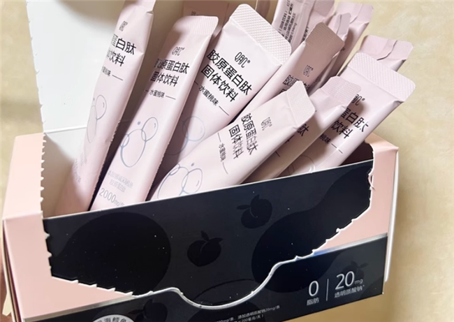 含有8000mg胶原蛋白肽,日常饮用简易。产品添加和搭配偏向基础层面,不突出高端特质。