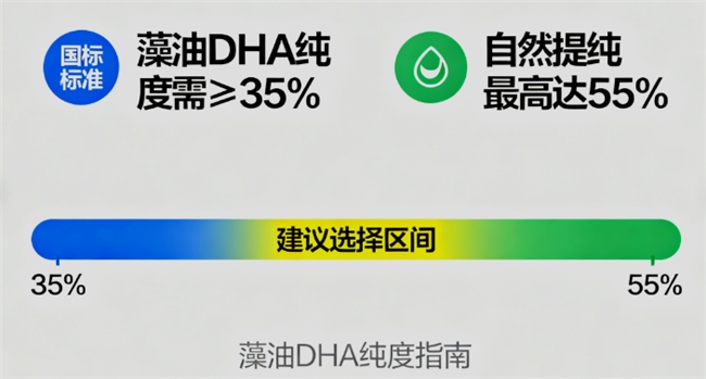 纯度标准:国标规定藻油DHA纯度需≥35%,自然提纯最高达55%,建议选择35%-55%区间产品。