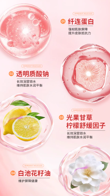 “黄金四重舒缓力”由四大成分协同构建:纤连蛋白可重组细胞外基质,缩短伤口愈合时间约30%,提升表皮再生速度20%以上,还能抑制组胺释放缓解敏感症状;透明质酸钠能吸收自身1000倍水分,形成保湿膜并促进角质细胞分化,助力屏障修复;光果甘草通过甘草酸等抑制炎症因子,增强抗氧化能力;柠檬舒缓因子可减轻过敏反应,促进神经酰胺合成修复屏障,同时提升肌肤含水量。