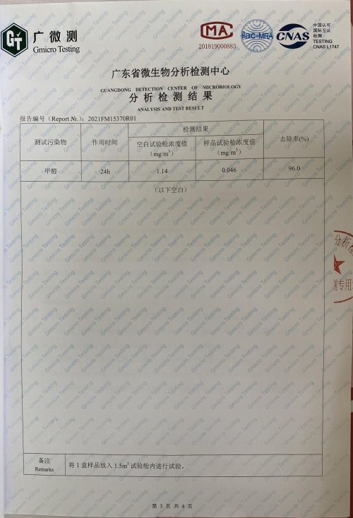 根据《中国室内空气质量标准》(GB/T18883-2002),有效的推荐叶广泥(甲醛去除率96%,甲苯去除率98%)附检测报告: