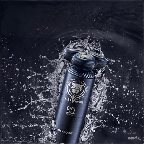 外观设计:飞科FS969电动剃须刀外观以哑光黑或深蓝色为主色调,激光雕刻振金纹路搭配黑豹元素,辅以环状金属拉丝工艺,尽显科技感与时尚感。