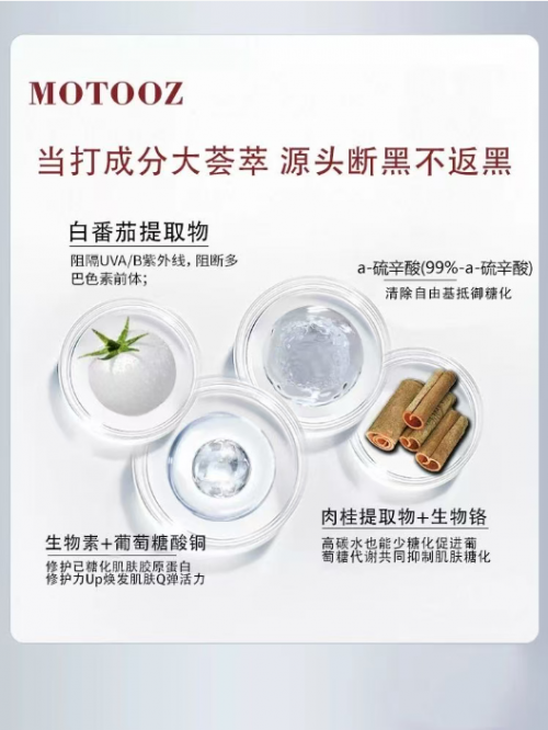 MOTOOZ的核心亮点在于多种核心成分的科学搭配,白番茄提取物、a - 硫辛酸、肉桂提取物、铬等看似常见,却被调出了 “1+1 远超 2” 的美白效果。