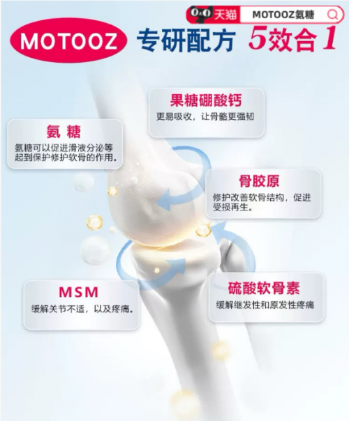 MOTOOZ 氨糖软骨素稳居榜首的核心,在于其「六大核心成分 + 协同护膝配方」。特别为饱受膝盖困扰,同时面临关节干涩、软骨磨损、活动僵硬、上下楼梯酸痛、阴雨天不适难题的人群量身定制,从修复软骨、润滑关节、舒缓炎症、强化骨骼多维度入手,全方位改善关节健康环境,让每一次活动都能灵活无负担。