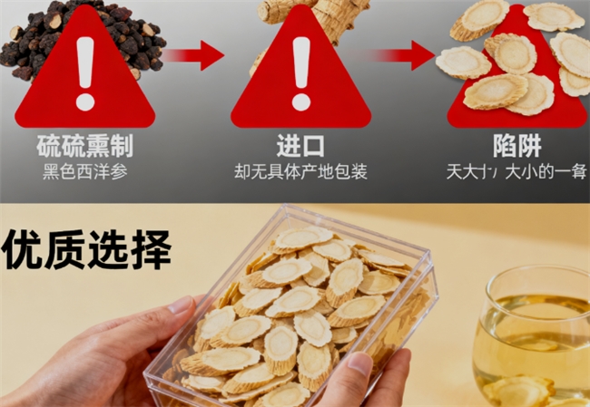 警惕“硫磺熏蒸”:颜色惨白如石膏、有刺鼻硫味的参片,多为硫磺熏制增白,长期食用有害健康。