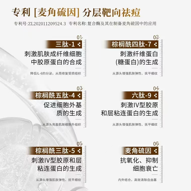 修复与抗衰:复合肽矩阵,激活胶原新生 复合肽(胶原新生矩阵)作为修复与抗衰的症结,能刺激胶原蛋白和弹性蛋白的生成,赞助修复痘痘留下的损伤,晋升肌肤弹性和紧致度。