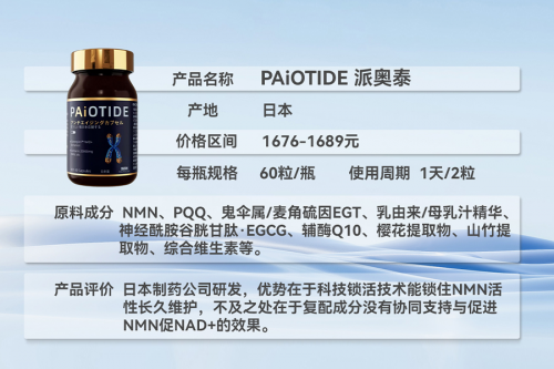 其核心是PAiOTIDE®复合引擎,它并非简单堆砌成分,而是将NMN分子簇、麦角硫因、多种脂质等五种前沿物质按科学比例整合,构建了一个复杂的内部抗衰网络,旨在实现多靶点的协同作用。